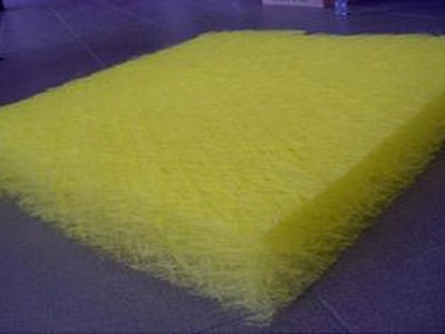 玻璃纤维棉将处于熔融状态的玻璃用离心喷吹工艺进行纤维化,喷涂热固性树脂制成的丝状材料,热固化后制成的产品。